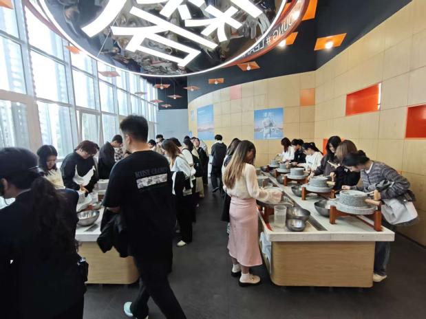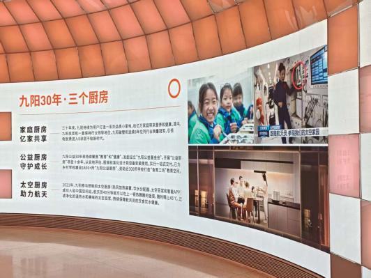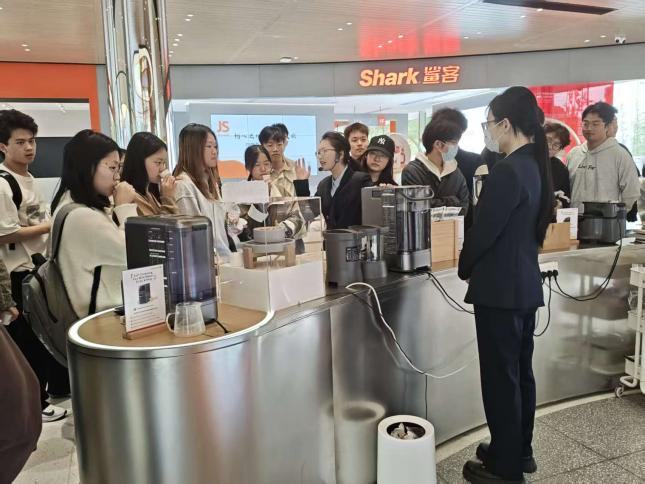在参观九阳品牌体验馆的过程中,同学们了解了九阳的发展历程并切身体验了九阳的各种产品。从1994年到今天,九阳打造了家庭厨房、公益厨房和太空厨房,从大众熟知的九阳豆浆机,已发展为涵盖厨房电器全领域的综合性企业。参观中,同学们亲身体验手磨豆浆带来的乐趣,也在挥汗间体会到了传统制作的艰辛不易。正是这些真实的使用场景,推动九阳不断改进产品,更好地满足用户需求。企业坚持自动化、智能化的发展路径,通过在隔音降噪、刀片技术和水净化系统等核心环节上的持续技术升级,让顾客买得放心、用得安心。在解说员的讲解下,同学们还深入了解了九阳从豆浆机扩展到电饭煲、空气炸锅、洗地机的产品矩阵及其技术迭代。在解说的过程中,同学们多次品尝了九阳豆浆机榨出的豆浆以及空气炸锅烹饪出的薯条等美食,为这次工业之旅带来了别样的趣味。